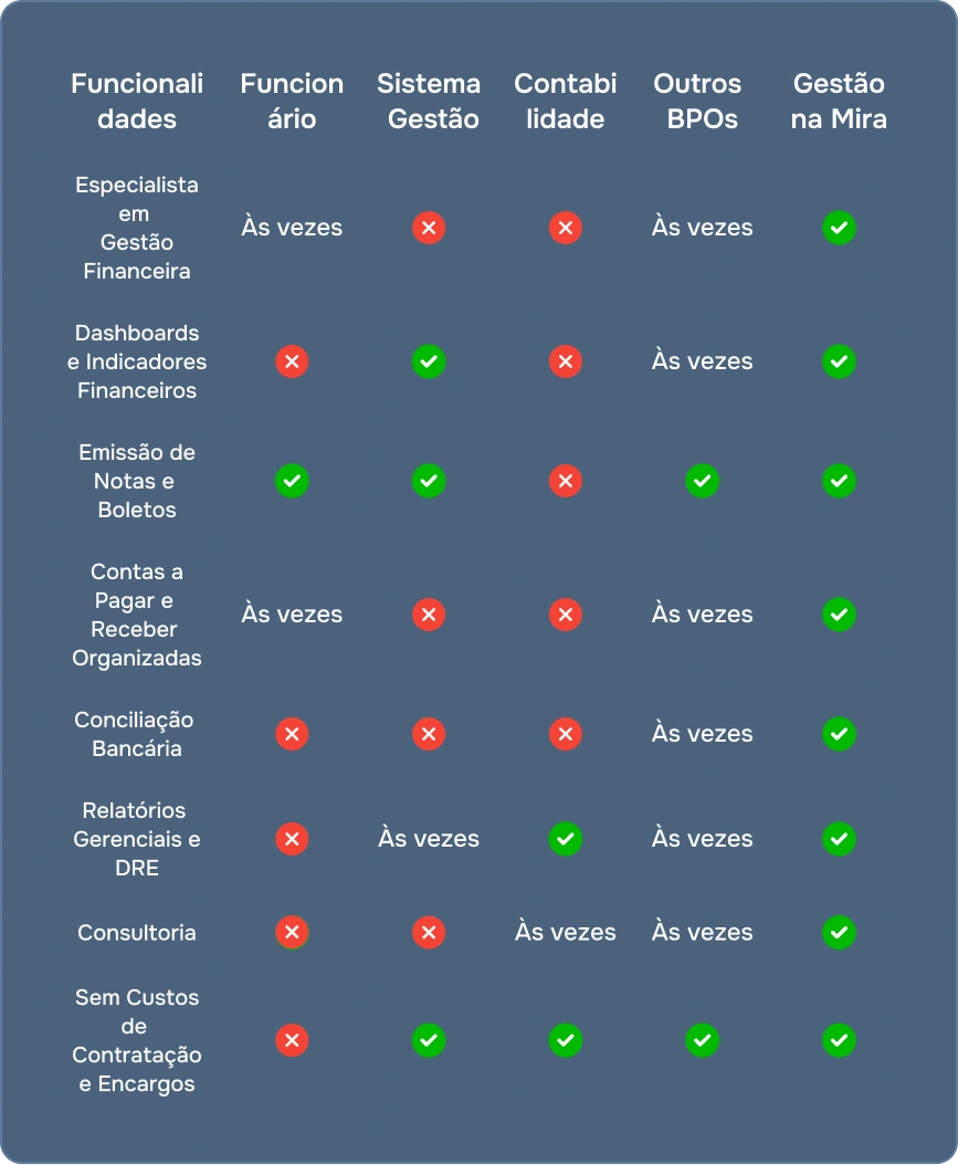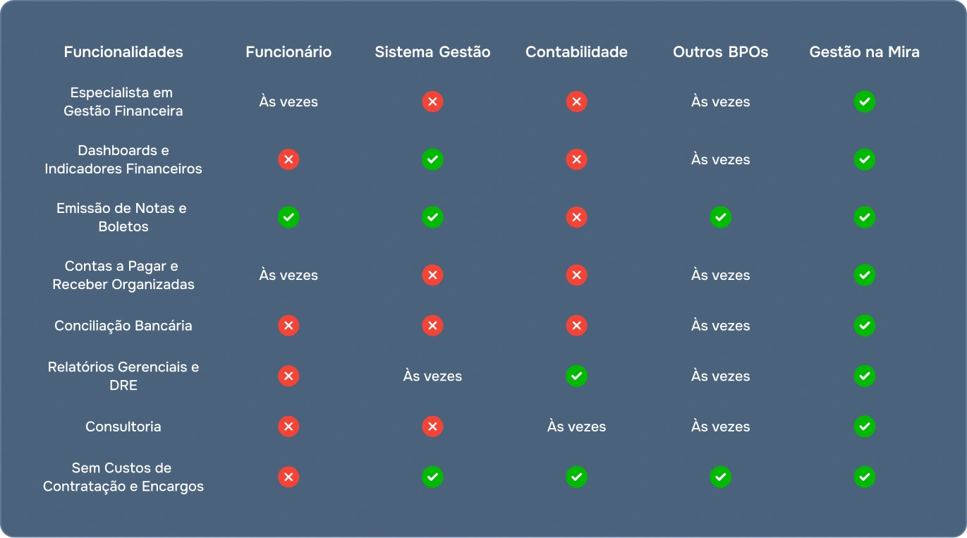 Enquanto um funcionário ou outros serviços entregam pouco e custam caro, com o Gestão na Mira você tem uma equipe de especialistas, sistema de gestão e contabilidade integrados, sem custo de contratação, encargos ou risco trabalhista.
